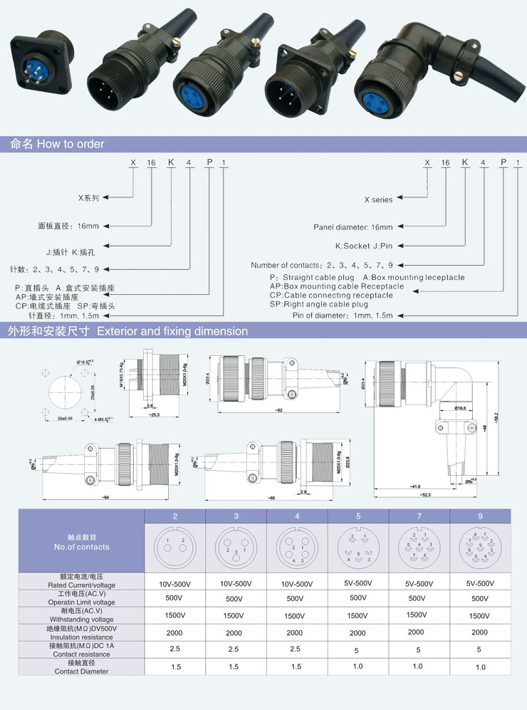 X16 waterproof connector is modified from Russian standard.These connectors have the features of small volume,light weight,Convenient application,high durability of plugging and unplugging,threaded coupling,good sealing performance,high conductivlty and high dielectric strength.including straightand syphon,the diameter is 16mm,contact pair has 9 kinds,2,3,4,5,7,9 pin.