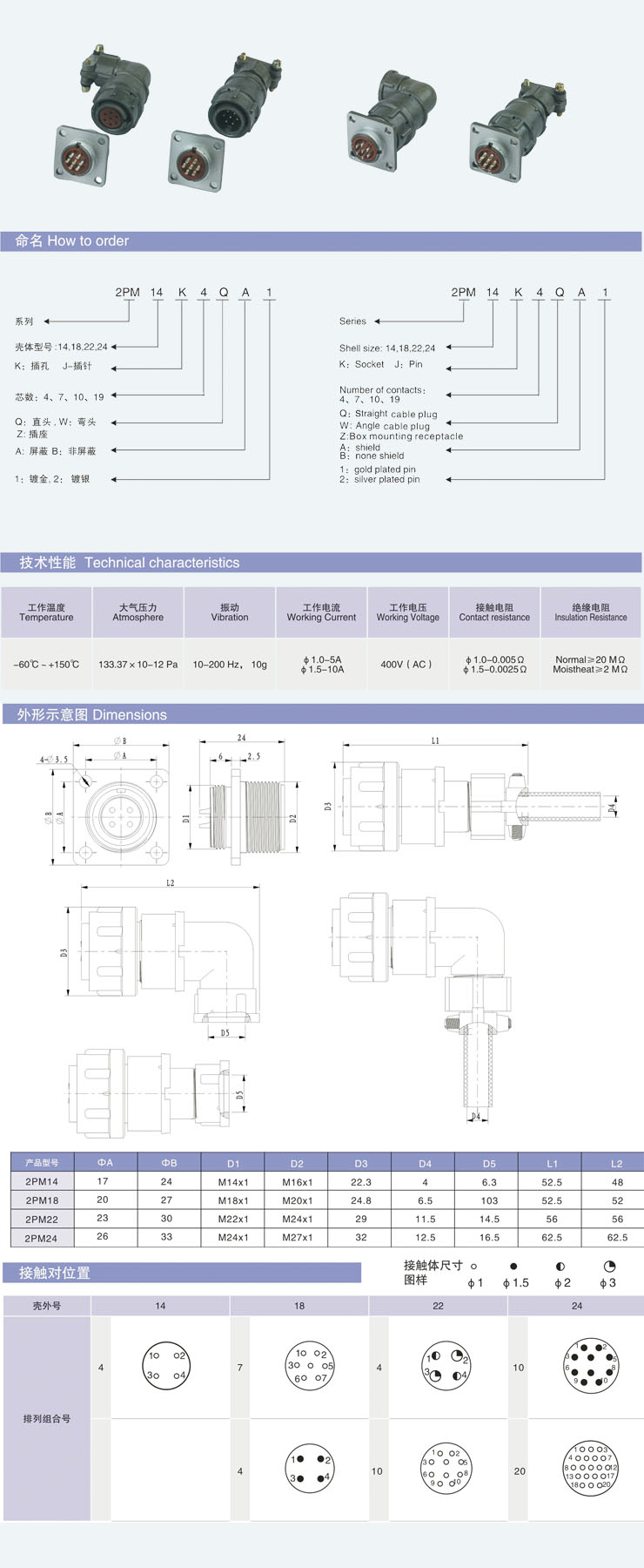 2PM系列連接器,主要是采用了俄羅斯連接器的技術(shù),其廣泛用于設(shè)備之間的電連接和信號傳輸,其獨有的外形及結(jié)構(gòu)設(shè)計能彌補很多其他類似連接器在用途上的缺陷,例如外殼穿線孔及尾部螺絲的獨特設(shè)計,使起運用當(dāng)中更加便利科學(xué)。內(nèi)部絕緣體及插針插孔的結(jié)構(gòu)設(shè)計也增強了其獨有的穩(wěn)定及可靠性,此系列連接器同時也具體一定的防水性能,可以防止室外雨淋等現(xiàn)象,其特殊的結(jié)構(gòu)和使用r性能已經(jīng)贏得了市場的普遍認可。
