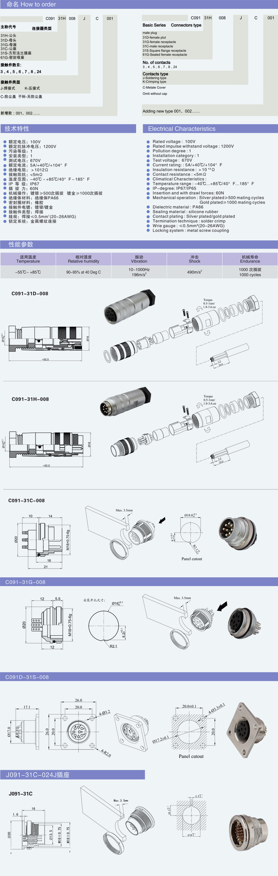 C091 series connectors are available with 3-8 contacts,threading couping,it can exchangeable with Amphenol C091 A/B/D & BINDER 423 series,meet DIN45326 standard.All connectors of C091 series are EMI protected and IP67 proof.Main applications for C091 connectors are industrial controls,data processing,instrumentation,medical devices,telecommunication network and equipment,outdoor and marine application,Cable connector main applications for 3G Tower Mounted Amplifier,Base Stations.