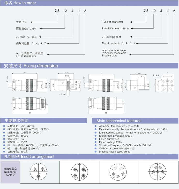 XS12 series push pull connector panel mounted size is 12mm.contact quantity are subdivided into 4 klnds of 3.4.5 and 7pins.the plug has two types.one is cable plug,the other is with rubber sleeve.the socket has two shapes.square and circular both of the印can be dlrectly mounted.the connector is compact and has a nice looking appeance.quick and easy for inserting and withdrawing.products are suitable for connectlon of bothA.c.and D.C.circulis of various instruments and electronic equipments.