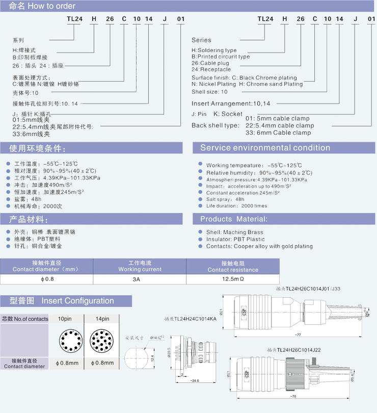 TL24 Series electric connector adopts the push-pull,self-locking connection mode,convenient to use,has small volume,high density,good resistance to environment,beautiful appearance,characteristics of good shielding etc..Products are mainly used in instruments,electrical and electronic equipment in DC or AC circuit connection.
