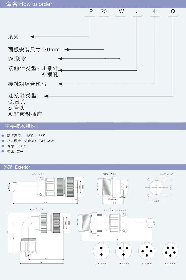 P20W系列防水連接器,插座與面板配合尺寸為20mm,芯數(shù)有2,3,4,5四種.電流25A.接線類型為焊接式.此款產(chǎn)品裝上合適的電纜線后防護(hù)等 級可達(dá)IP67。