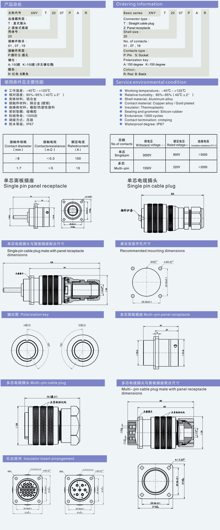 XNY series connector is mainly used for the electric vehicle industry, to provide a stable voltage between devices, large current transmission and signal transmission, these series of products using pull push type locking structure, can realize automatic locking, especially suitable for the operation of small space and limited installation space. XNY product has five kinds polarization key to avoid mismating, and each key corresponding to different colors, Waterproof degree IP67.